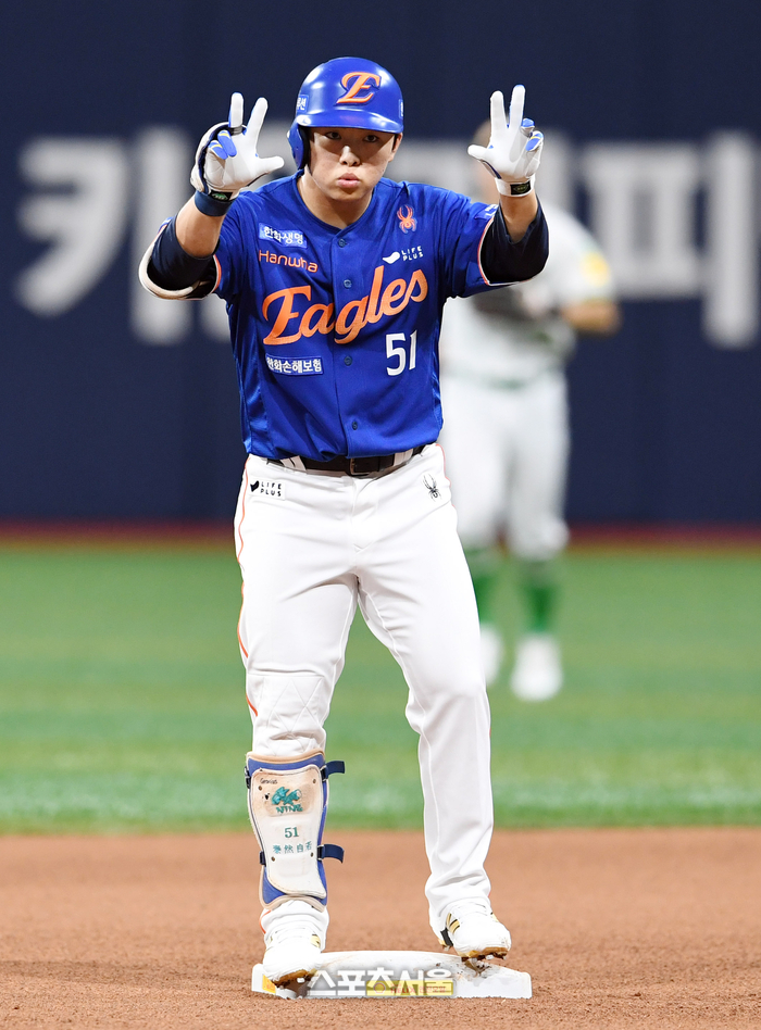 한화 문현빈이 26일 고척스카이돔에서 열린 2025 KBO리그 키움과 경기 4회초 2사 키움 선발 알칸타라를 상대로 2루타를 치고 세리머니를 하고 있다. 2025. 8. 26.