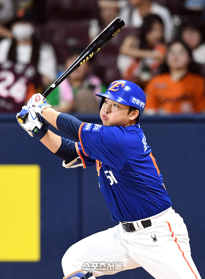 한화 문현빈이 26일 고척스카이돔에서 열린 2025 KBO리그 키움과 경기 4회초 2사 키움 선발 알칸타라를 상대로 2루타를 치고 있다. 2025. 8. 26.
