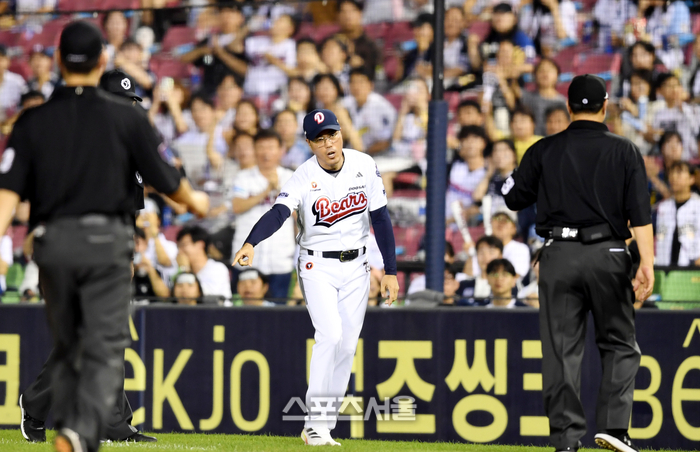 두산 조성환 감독대행이 26일 서울 잠실구장에서 열린 2025 KBO리그 삼성과 경기 6회말 오명진 외야타구 페어/파울 관련 비디오 판독이 파울로 판정되자 항의하고 있다.