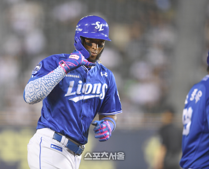 삼성 디아즈가 26일 서울 잠실구장에서 열린 2025 KBO리그 두산과 경기 7회초 1사1루 우중월 홈런을 날린 후 이종욱 코치와 세리머니를 하고 있다.