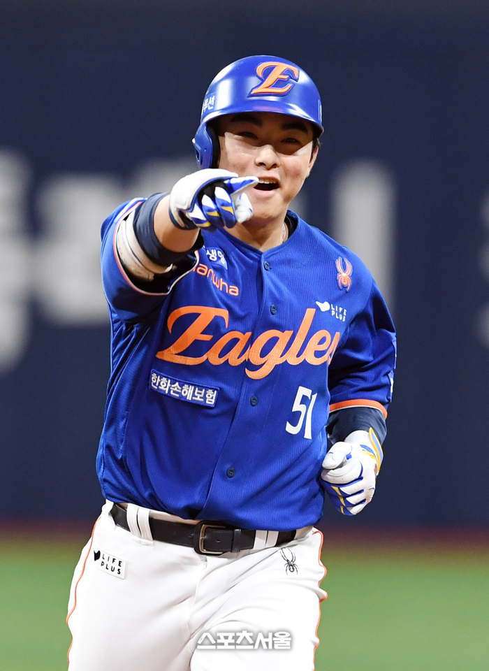 한화 문현빈이 26일 고척스카이돔에서 열린 2025 KBO리그 키움과 경기 9회초 무사 키움 투수 조영건을 상대로 솔로 홈런을 친 뒤 기뻐하고 있다. 문현빈의 시즌 12호 홈런. 2025. 8. 26.