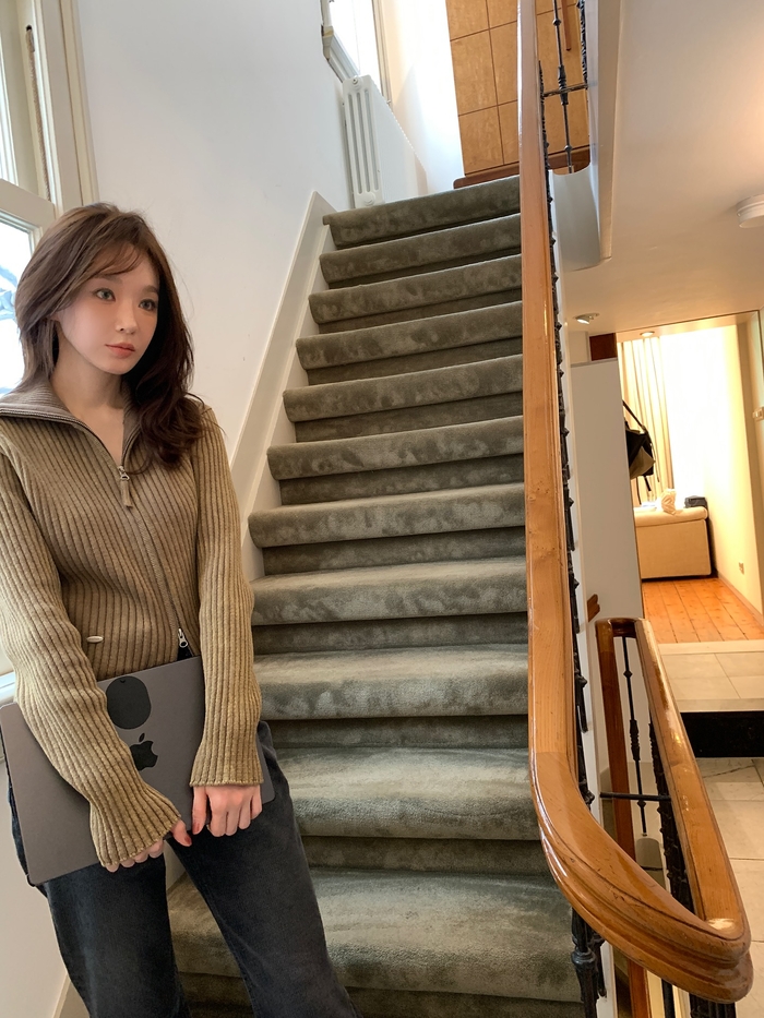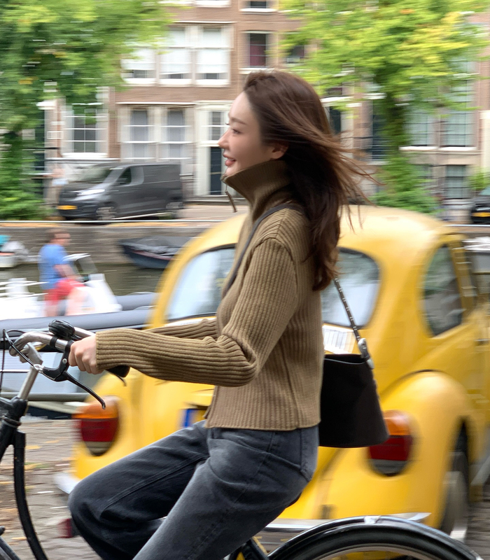강민경은 코지한 골지 니트와 다크 그레이 팬츠, 블랙 숄더백을 착용한 캐주얼한 룩으로 도시 곳곳을 즐기고 있다.