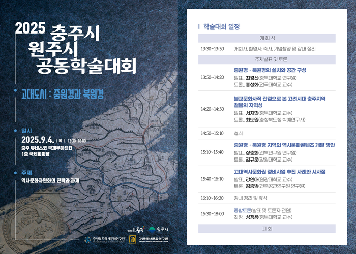 원[스포츠서울ㅣ원주=김기원기자]원주시(시장 원강수)와 충주시(시장 조길형)가 주최하고, 강원역사문화연구원(원장 최종모)과 충청북도역사문화연구원(원장 김양희)이 주관하는 ‘고대도시: 중원경과 북원경’ 학술대회가 오는 9월 4일(목) 오후 1시 30분부터 충주시 유네스코 국제무예센터 국제회의장에서 개최된다.