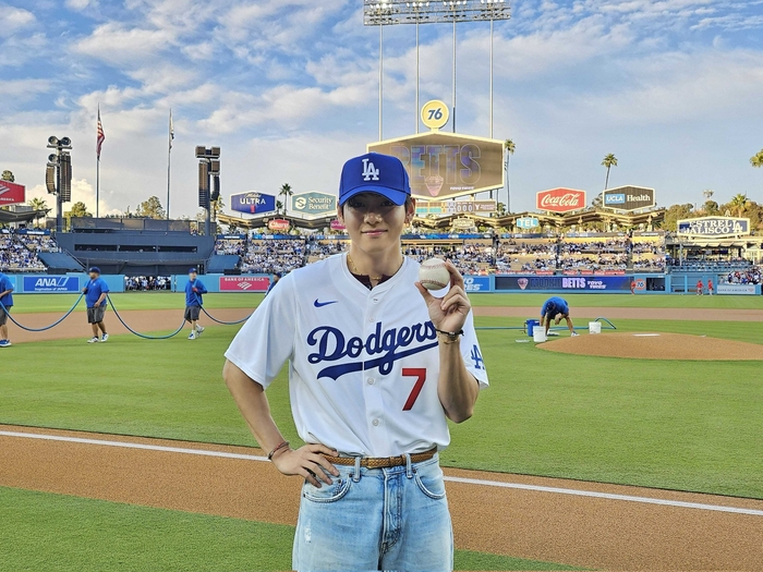 26일 다저스와 신시내티전 시작에 앞서 시구자로 나선 뷔는 등번호 7번이 새겨진 다저스 유니폼을 입고 시포를 맡은 야마모토 요시노부와 호흡을 맞췄다.