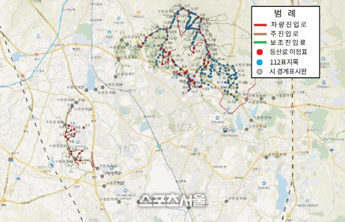 시는 지난 3월 수원소방서, 수원중부경찰서와 광교산·칠보산 안내시설물의 관리 번호 연계·위치정보 공유 방안을 논의하고, 협업 체계를 구축하고, 최근까지 고성능 GNSS(위성항법시스템) 측량 장비를 활용해 광교산·칠보산의 시 경계표시판, 등산로 이정표, 112표지목의 위치를 정밀 측량하고, 디지털화해 정밀한 좌표를 확보했다.