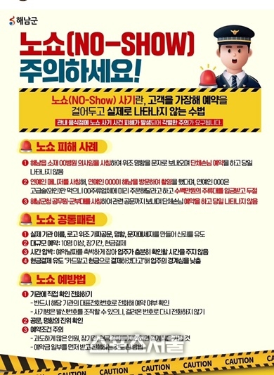 이에 해남군은 관련 기관과 긴밀히 협력해 노쇼 사기 예방을 위한 합동 활동을 펼치고 있으며, 피해 확산을 막기 위해 홍보물도 제작해 음식점 업주들에게 배포하는 등 적극적인 대응에 나서고 있다.
