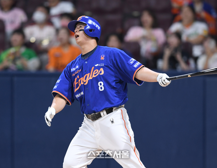 한화 노시환이 27일 서울 고척스카이돔에서 열린 2025 KBO리그 키움과 경기 2회초 타구를 바라보고 있다. 좌익수 플라이 아웃.