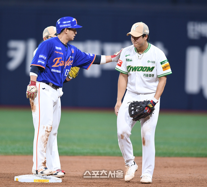 한화 최재훈이 27일 서울 고척스카이돔에서 열린 2025 KBO리그 키움과 경기 3회초 무사1루 심우준 내야땅볼 때 상대 어준서 실책으로 2루로 진루한 후 괜찮냐고 물어보고 있다.