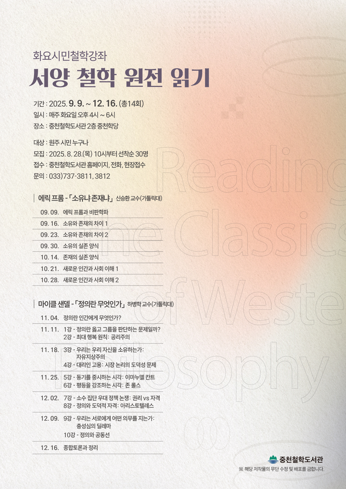 강좌는 원주시민 누구나 신청 가능하며, 8월 28일 오전 10시부터 중천철학도서관 홈페이지 또는 전화(☎033-737-3811)로 신청하면 된다.