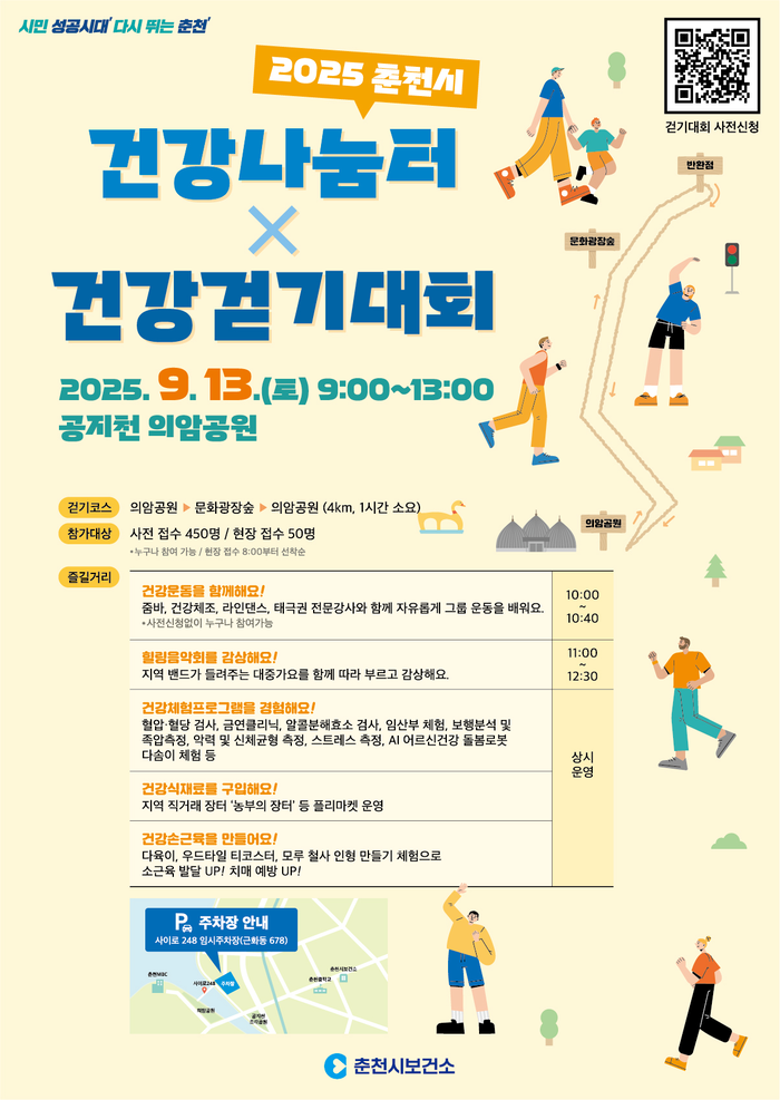 건강걷기대회는 사전접수 450명, 현장접수 50명으로 총 500명이 참여 가능하며 참가비는 무료다. 신청은 춘천시보건소 홈페이지와 시 공식 SNS의 QR코드·참여링크를 통해 가능하다.