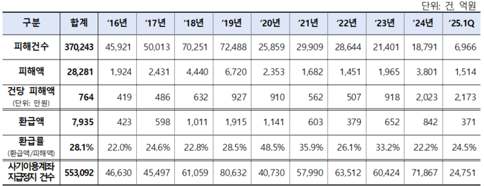 사기이용 계좌 지급정지 건수는 2020년 4만여 건에서 2024년 약 7만 2천 건으로 크게 늘며 증가세가 이어지고 있다. 그러나 지급정지를 통해 실제 환급이 이뤄진 금액은 전체 피해액의 28% 수준에 그쳤다. 지난 10년간 피해금 2조 8281억원 중 환급된 금액은 7935억원에 불과했으며, 환급률은 해마다 큰 변동 없이 정체된 것으로 집계됐다.