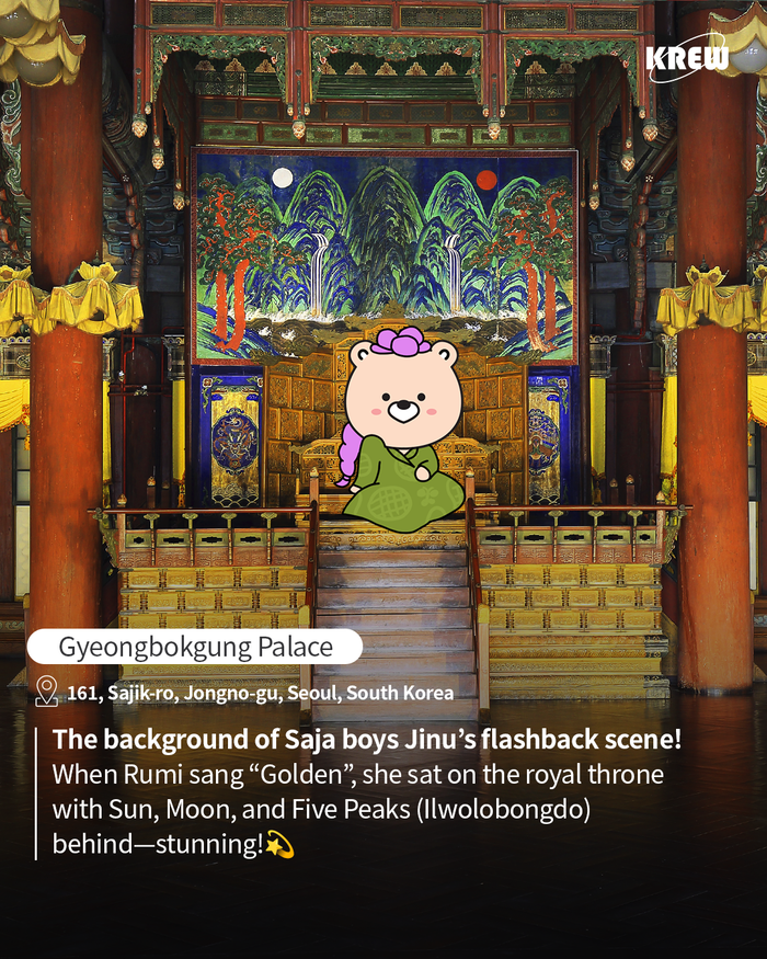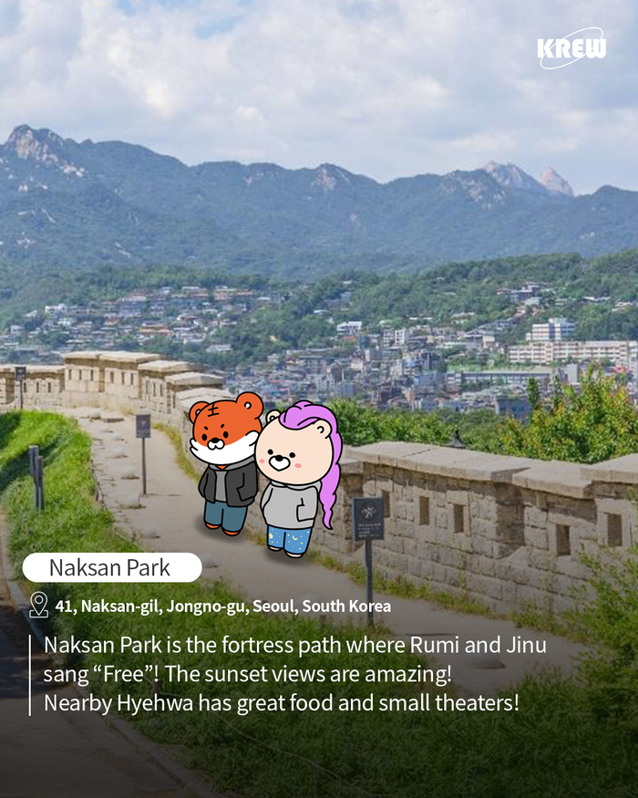 주인공 진우와 루미가 OST ‘Free’를 함께 부른 낙산공원 등은 한국인에게는 이미 유명한 관광지이지만, ‘케데헌’을 통해 막 한국에 관심을 갖게 된 외국인도 쉽게 정보를 찾을 수 있도록 공사가 운영하는 한국관광통합플랫폼 VISITKOREA와 소셜미디어(SNS) 등을 통해 케데헌 속 주요 배경지를 소개했다. ▲낙산공원 ▲경복궁 ▲북촌 한옥마을 등 각 관광지 사진에는 한국관광 대표 캐릭터 ‘킹덤프렌즈’가 케데헌 속 장면을 재현해 읽는 재미를 더했다.