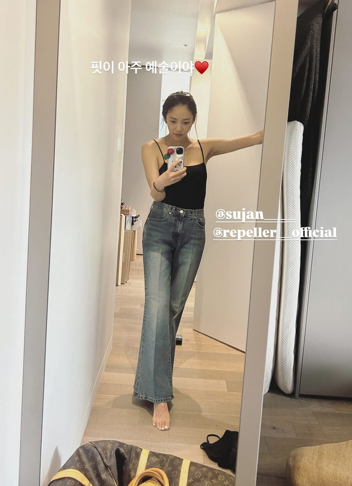 또 다른 사진에서는 슬림한 블랙 슬리브리스에 롱 데님 팬츠를 매치해 늘씬한 몸매와 건강한 에너지를 자랑했다.