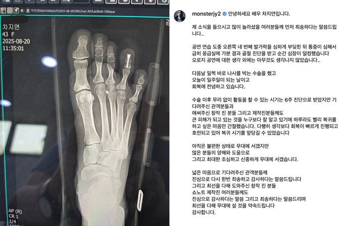 차지연은 28일 자신의 SNS를 통해 “제 부상 소식에 놀란 분들께 죄송하다는 말씀을 먼저 전한다”며 X 레이 사진과 사과문을 게재했다.