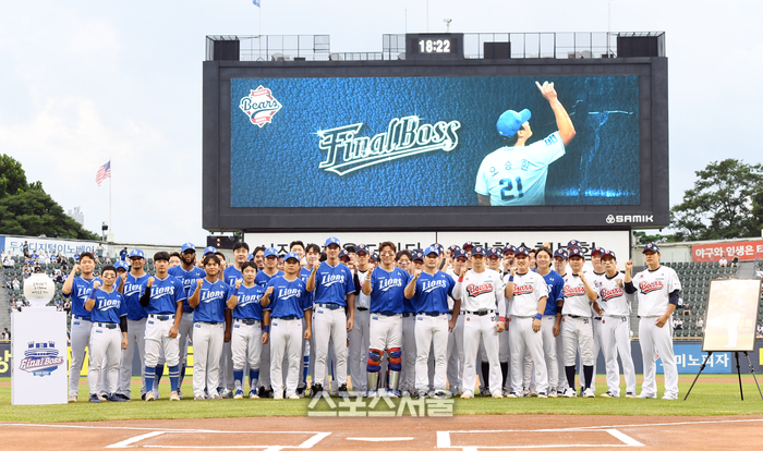 삼성 오승환(가운데)이 28일 잠실구장에서 열린 2025 KBO리그 삼성과 두산의 경기에 앞서 은퇴 투어의 일환으로 양 팀 선수들과 기념촬영을 하고 있다. 2025. 8. 28.