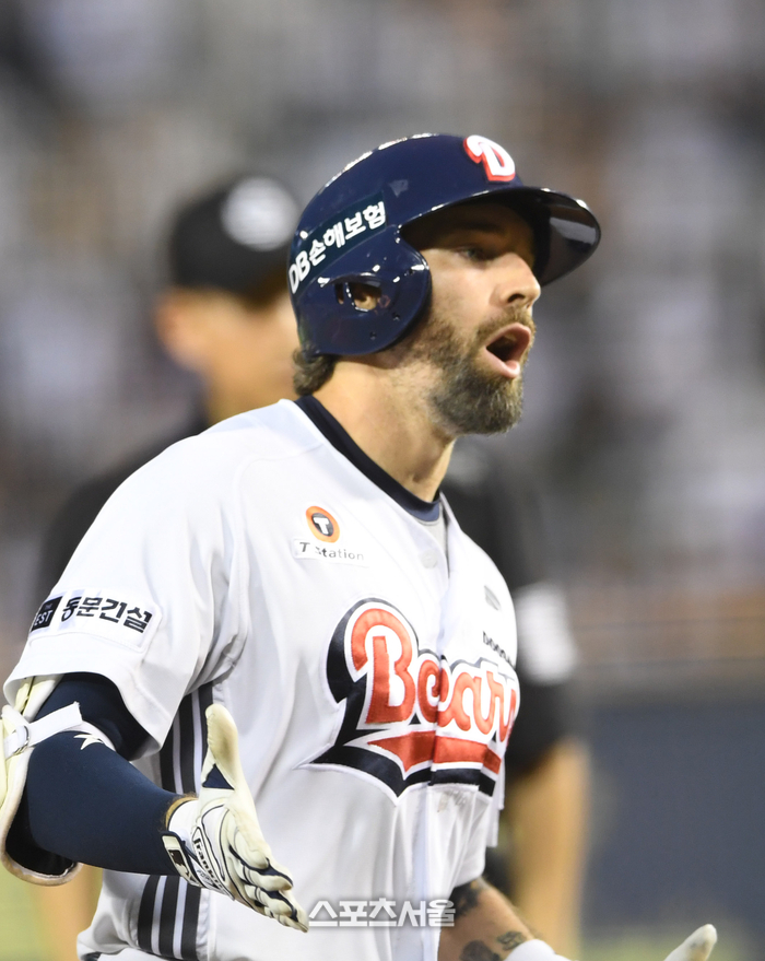 두산 케이브가 28일 잠실구장에서 열린 2025 KBO리그 삼성과 경기 2회말 2사 1루 상황에서 삼성 선발투수 최원태를 상대로 2점 홈런을 친 뒤 세리머니를 하고 있다. 케이브의 시즌 13호 홈런. 2025. 8. 28.