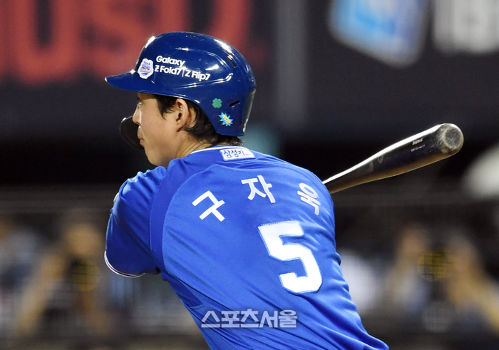 삼성 구자욱이 28일 잠실구장에서 열린 2025 KBO리그 두산과 경기 5회초 2사 1-2루 상황 두산 투수 박신지를 상대로 2타점 2루타를 치고 있다. 2025. 8. 28.