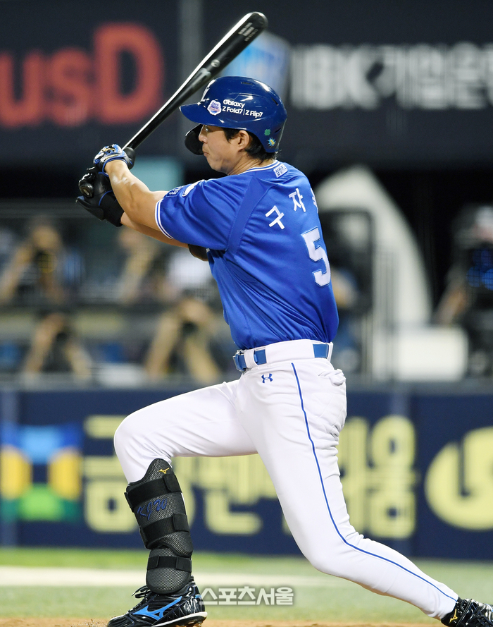 삼성 구자욱이 28일 잠실구장에서 열린 2025 KBO리그 두산과 경기 5회초 2사 1-2루 상황 두산 투수 박신지를 상대로 2타점 2루타를 치고 있다. 2025. 8. 28.