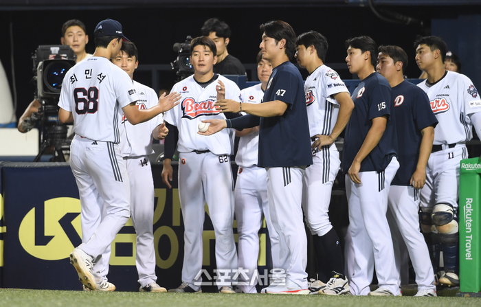 두산 선발투수 최민석이 28일 잠실구장에서 열린 2025 KBO리그 삼성과 경기 5회초 2사 1-2루 상황에서 마운드에서 내려가면서 동료들과 하이파이브를 하고 있다. 최민석은 6-2로 앞선 상황에서 승리 투수 요건에 아웃카운트 하나만을 남겨두고 강판되었다. 2025. 8. 28.