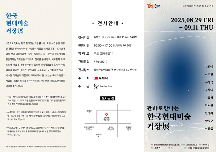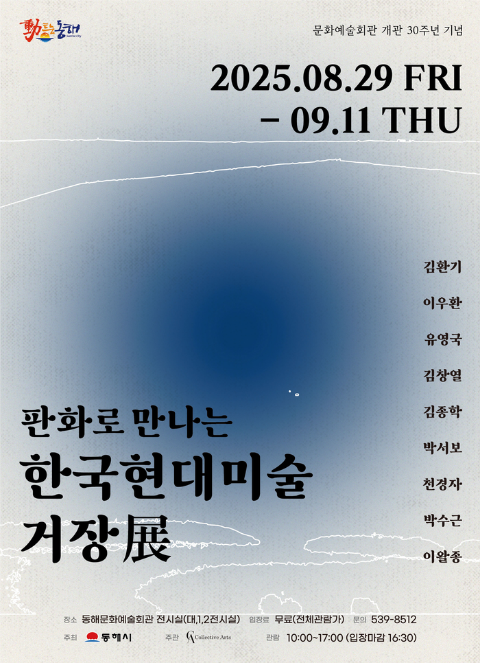 [스포츠서울ㅣ김기원기자]동해시는 개관 30주년을 맞아 오는 8월 29일부터 9월 11일까지 14일간, 동해문화예술회관 전시실에서 기쵝 초청 전시「한국현대미술거장 展」을 개최한다고 밝혔다.