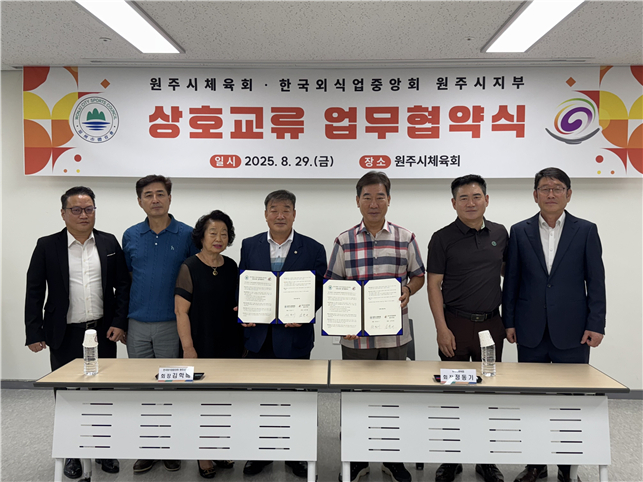 [스포츠서울ㅣ원주=김기원기자]원주시체육회(회장 정동기)와 한국외식업중앙회 원주시지부(회장 김학배)는 2025년 8월 29일(금), 남부복합체육센터 2층 회의실에서 지역사회 상생 발전을 위한 업무협약(MOU)을 체결했다.