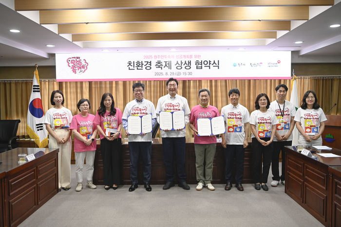 1부 행사에서는 원주시, 원주문화재단, 국민건강보험공단 서울강원지역본부 등 3개 기관이 함께 친환경축제 상생협약을 맺었다. 각 기관은 다회용기 활용, 친환경 제품 사용 등 친환경 협력 체계를 강화하기로 했다.