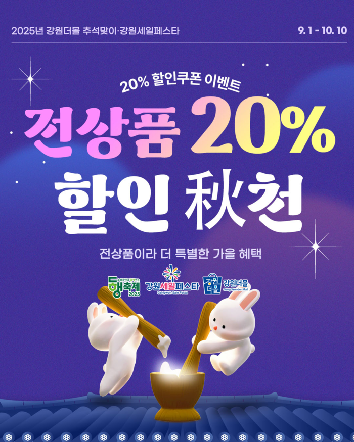 [스포츠서울ㅣ춘천=김기원기자]강원특별자치도(도지사 김진태)의 대표 온라인 쇼핑몰 ‘강원더몰’(www.gwdmall.kr)이 2025년 추석을 맞아 ‘동행축제· 강원세일축제(페스타)’와 함께 9월 1일부터 10월 10일까지 40일간 ‘추석맞이 기획전’을 개최한다. 이번 기획전은 입점 기업의 매출 확대와 소비자의 합리적인 명절 쇼핑을 지원하기 위해 기획됐다.