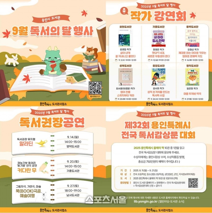 〔스포츠서울│용인=좌승훈기자〕경기 용인시는 9월 ‘독서의 달’을 맞아 독서감상문 대회 등 풍성한 독서 문화 행사를 준비했다고 1일 밝혔다.
