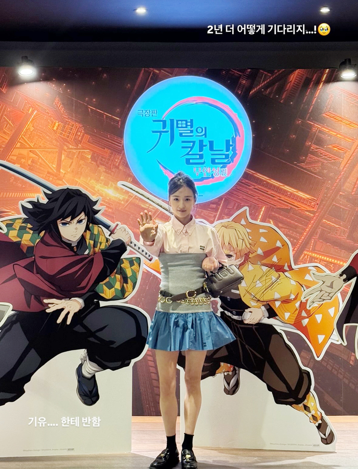 사진 속 손연재는 ‘귀멸의 칼날’ 주인공 캐릭터들인 기유와 젠이츠의 대형 판넬 앞에서 밝은 미소와 함께 포즈를 취하고 있다. 스타일리시한 미니 스커트와 니트, 체인 벨트, 미니 백을 매치한 센스 있는 패션도 눈길을 끈다. 팬다운 설렘을 드러내며 만화 캐릭터에 대한 애정을 표했다.