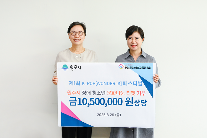 [스포츠서울ㅣ원주=김기원기자](사)우리문화예술교육진흥원(대표 김가연)은 지난 29일 원주시청을 방문해 원주시 장애인·아동 복지시설에 1,050만 원 상당의 공연 입장권 150매를 후원했다. 공연은 10월 10일 개최되는 ‘제1회 원주 K-POP 페스티벌 WONDER-K Festival’이다.