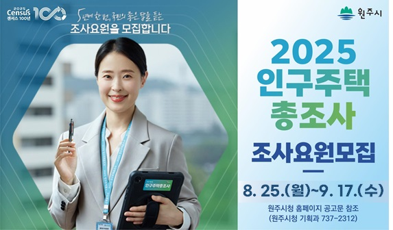 [스포츠서울ㅣ원주=김기원기자]원주시는 11월 1일부터 18일까지 실시되는 ‘2025 인구주택총조사’에 참여할 조사요원 모집 기한을 8월 29일에서 9월 17일로 연장한다.