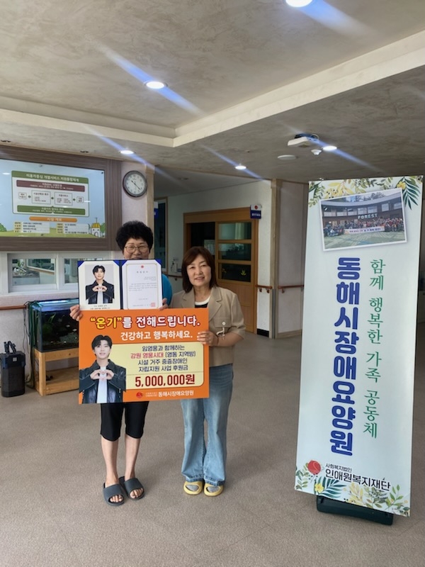 [스포츠서울ㅣ김기원기자]임영웅 팬클럽 ‘영웅시대’(강원도 영동지역방)는 8월 30일(토), 동해시장애요양원(원장 조은희)을 방문해 중증장애인의 자립지원을 위한 후원금 500만원을 기탁했다.