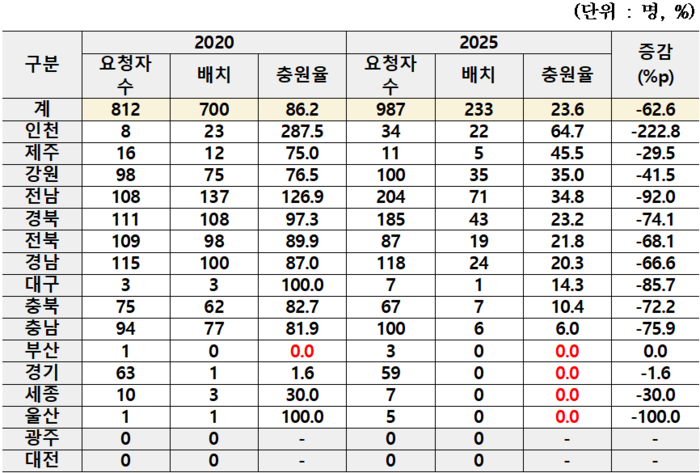 지역별로 보면, 2020년 당시 충원율이 가장 낮았던 곳은 요청 1명 중 단 1명도 배치받지 못한 부산(0%)이었으며, 경기(63명 요청·1명 배치, 1.6%), 세종(10명 요청·3명 배치, 30%)이 뒤를 이었다.
