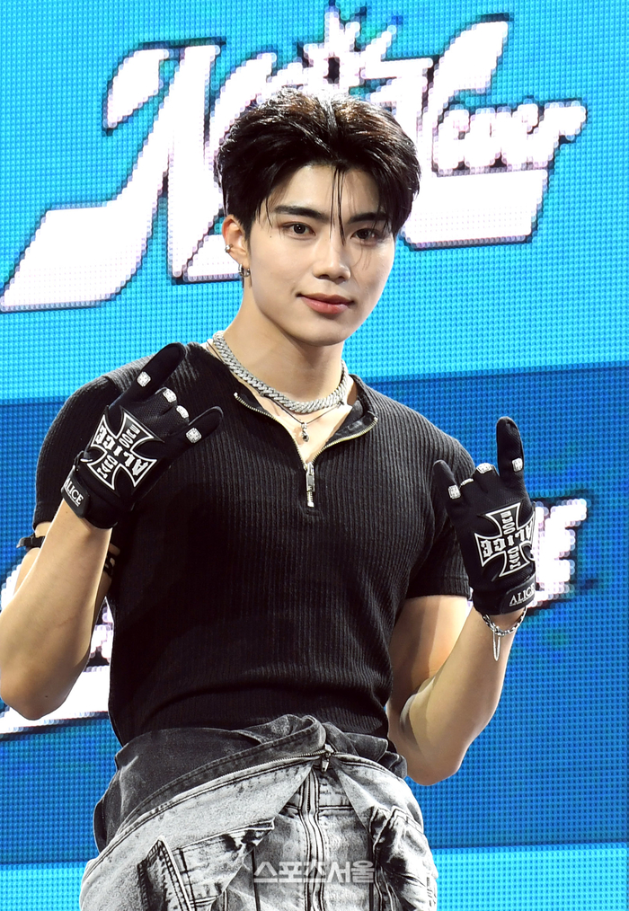 제로베이스원(ZEROBASEONE)의 박건욱이 1일 서울 용산구 블루스퀘어에서 진행된 정규 1집 ‘네버 세이 네버(NEVER SAY NEVER)’ 발매 기념 미디어 쇼케이스에서 취재진을 향해 포즈를 취하고 있다. 2025. 9. 1.