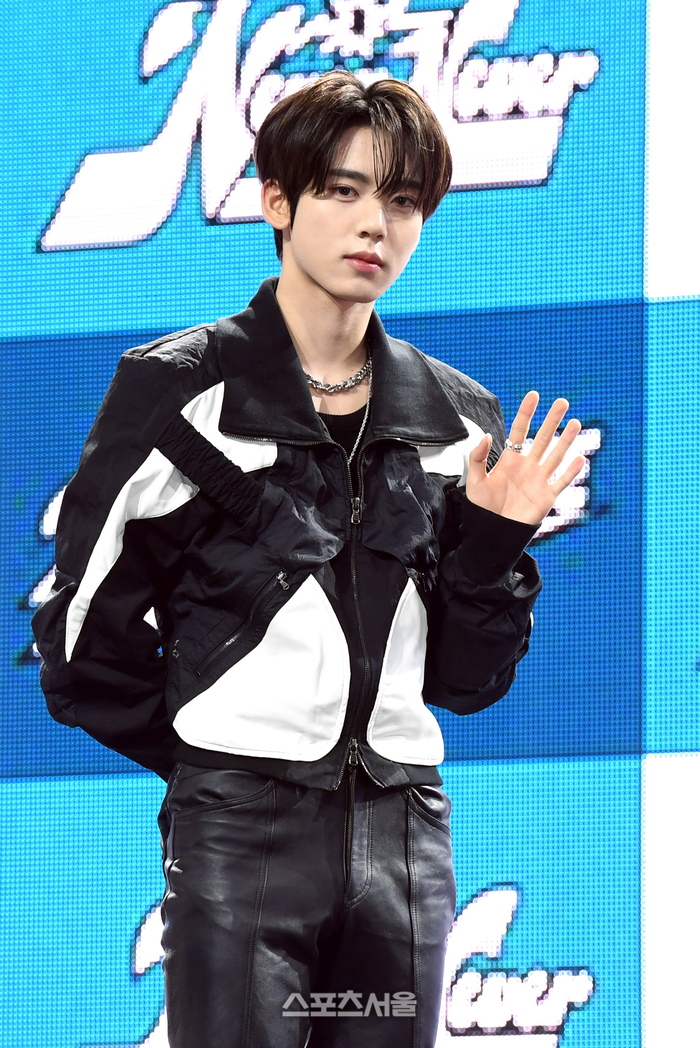 제로베이스원(ZEROBASEONE)의 한유진이 1일 서울 용산구 블루스퀘어에서 진행된 정규 1집 ‘네버 세이 네버(NEVER SAY NEVER)’ 발매 기념 미디어 쇼케이스에서 취재진을 향해 포즈를 취하고 있다. 2025. 9. 1.