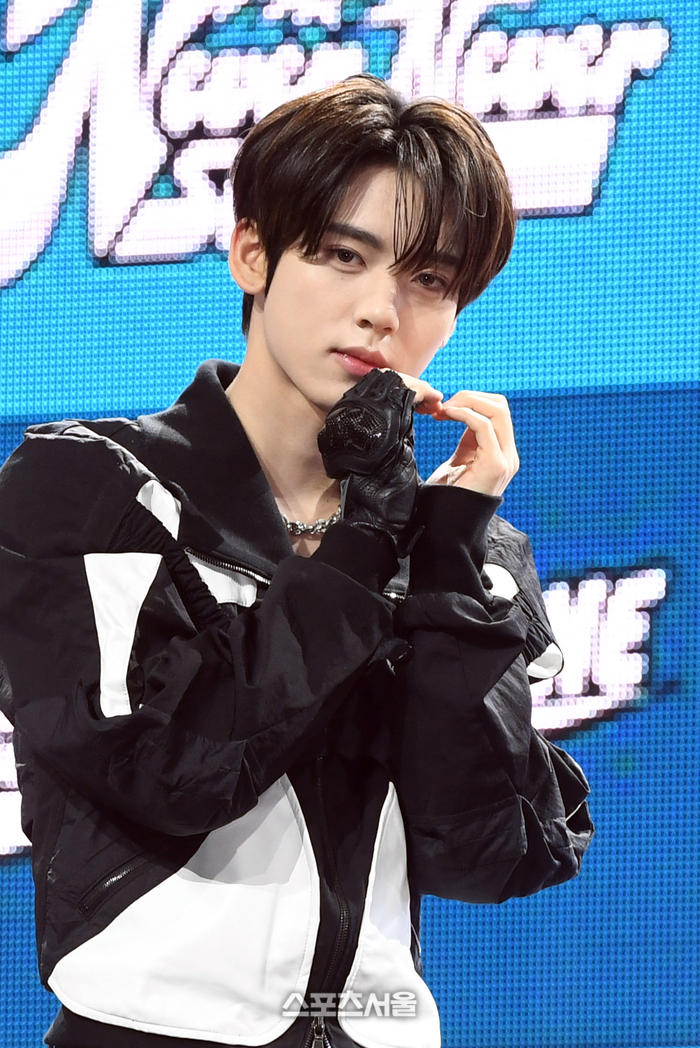 제로베이스원(ZEROBASEONE)의 한유진이 1일 서울 용산구 블루스퀘어에서 진행된 정규 1집 ‘네버 세이 네버(NEVER SAY NEVER)’ 발매 기념 미디어 쇼케이스에서 취재진을 향해 포즈를 취하고 있다. 2025. 9. 1.