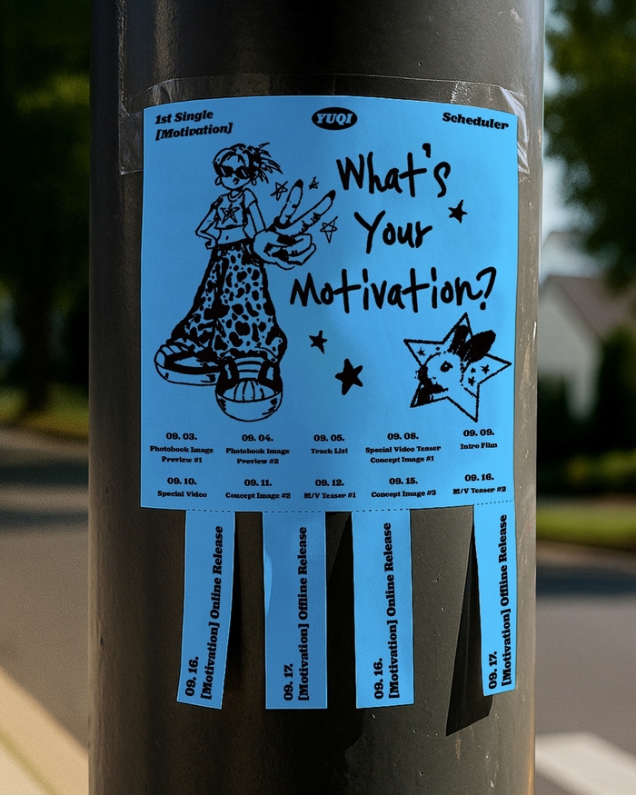 우기는 오는 3일 포토북 이미지 프리뷰를 시작으로 트랙리스트, 인트로 필름, 스페셜 비디오, 콘셉트 이미지, 뮤직비디오 티저 등 싱글 발매까지 다양한 프로모션으로 글로벌 팬심 저격한다. 프로모션 스케줄러는 90년대 힙합룩을 입은 키치한 캐릭터와 우기를 상징하는 토끼가 그려진 길거리 전단지 형태로, 티저 이미지에 이어 ‘What’s Your Motivation?‘이라는 질문을 던져 궁금증을 더했다.