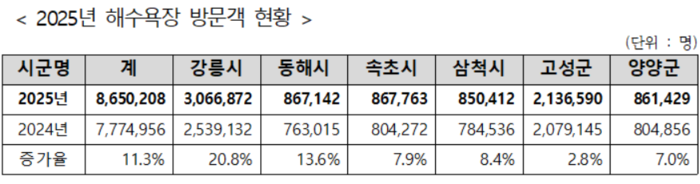 [스포츠서울ㅣ춘천=김기원기자]강원특별자치도(도지사 김진태)는 2025년 여름, 도내 83개 해수욕장을 찾은 방문객이 총 865만 명으로 집계돼 2024년 대비 11.3% 증가했으며, 코로나19 엔데믹 이후 최다 방문객 수를 기록했다고 밝혔다.