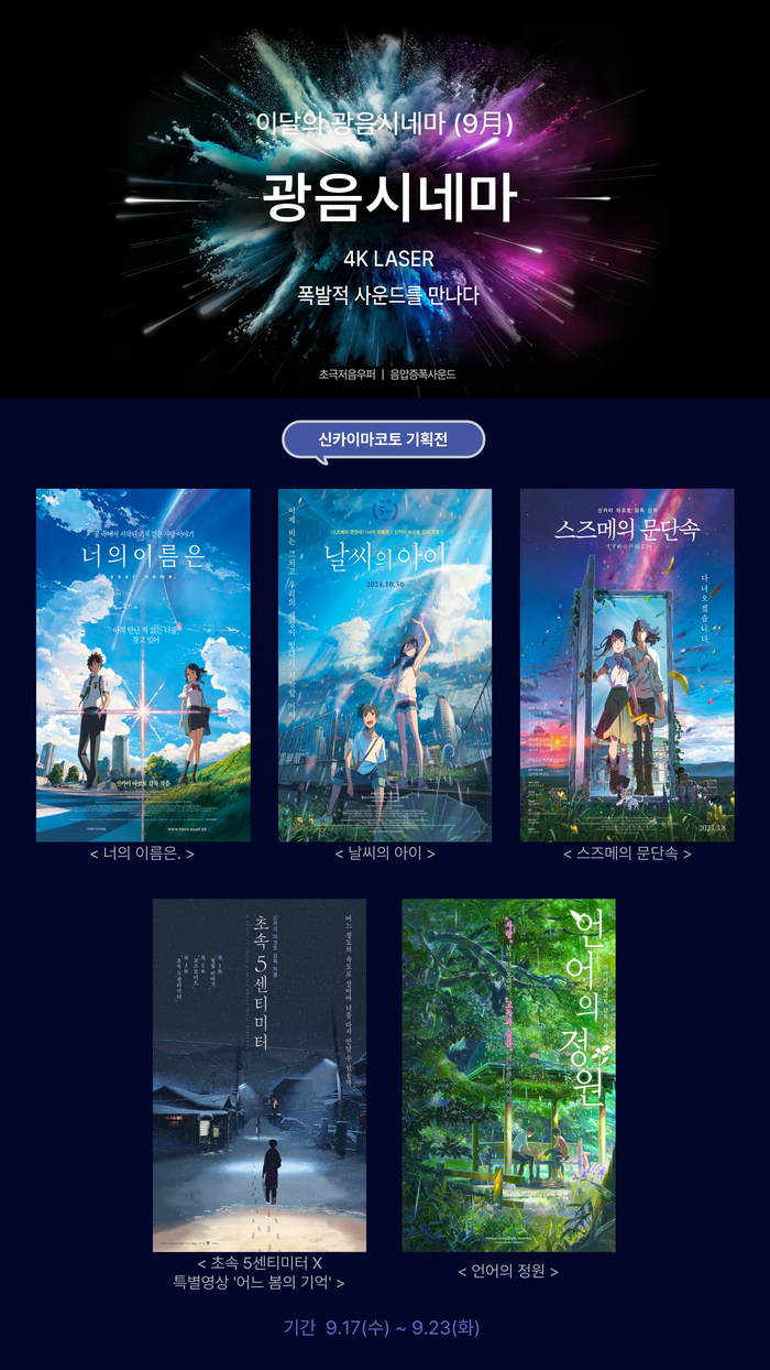 9월 광음시네마는 ‘신카이 마코토’ 감독의 기획전으로 진행되며, 대표작 다섯 작품을 상영한다.