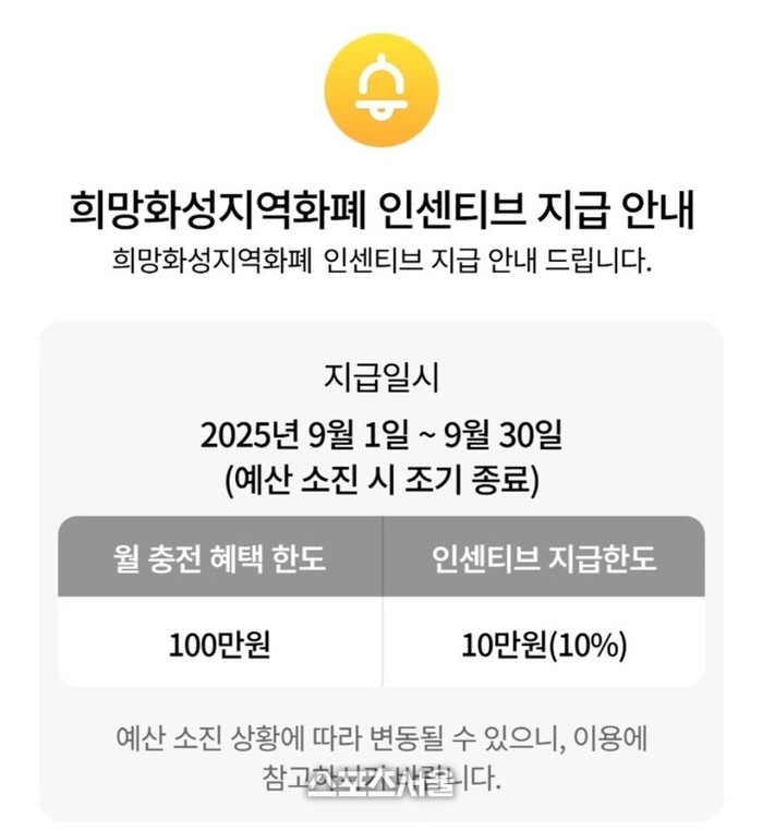 〔스포츠서울│화성=좌승훈기자〕경기 화성시는 9월과 10월 두 달간 ‘희망화성지역화폐’의 인센티브가 지급되는 개인별 구매 한도를 월 최대 50만 원에서 100만 원까지로 두 배 상향한다고 2일 밝혔다.