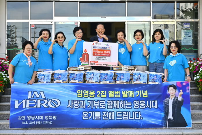 [스포츠서울ㅣ김기원기자]가수 임영웅 팬클럽 ‘강원 영웅시대 영북방(속초·고성·양양 지역방)(방장 백남희)’은 9월 2일, 속초시청을 방문하여 시 관내 장애인단체·시설과 속초시 지역사회보장협의체에 전달할 385만 원 상당의 10kg들이 백미 100포를 기탁했다.