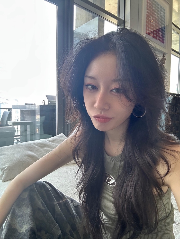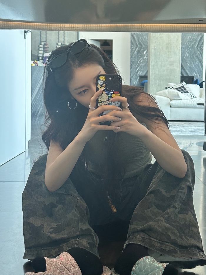 사진 속 지연은 롱 웨이브 헤어스타일과 카키색 나시 톱, 카무플라주 팬츠를 매치한 감각적인 패션을 선보였다. 심플하면서도 세련된 악세서리와 귀걸이, 다양한 각도에서 비치는 자연스러운 분위기가 돋보인다.