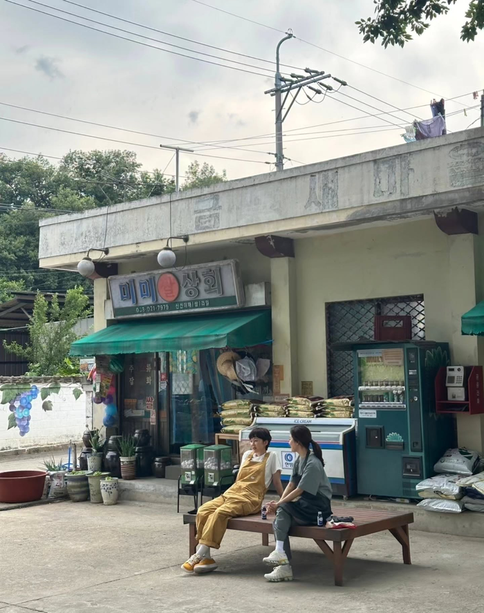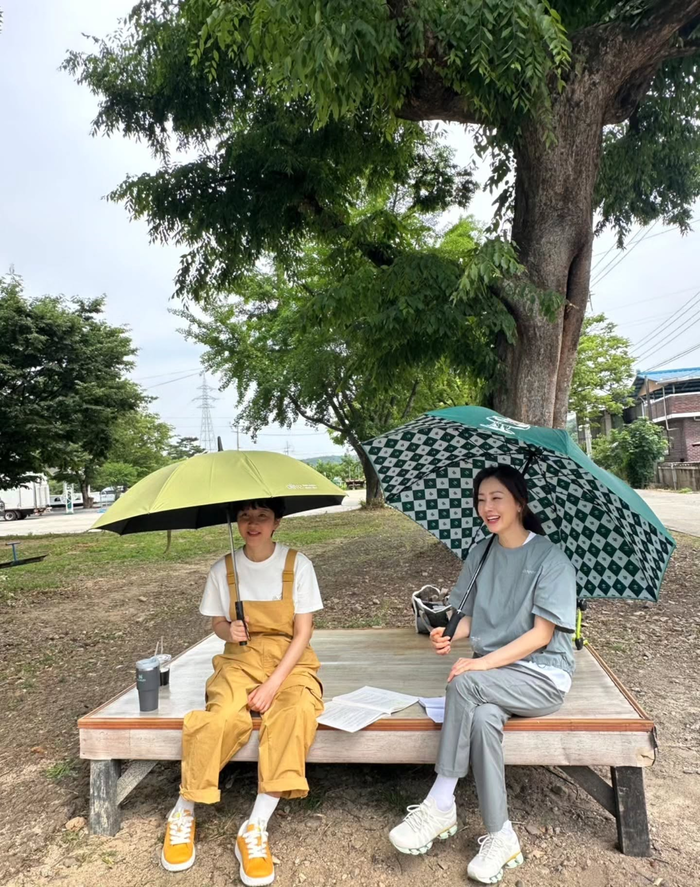 사진 속 오나라와 염정아는 드라마 대본을 들고 나란히 앉아 손가락으로 하트 포즈를 그려 보이며 즐거운 분위기를 자아낸다. 또 다른 사진에서는 우산을 들고 대본을 읽으며 집중하는 모습이 담겨 현장 열기가 전해진다. 두 사람은 야외 촬영장에서 편안한 복장과 환한 미소로 휴식을 취하고 있다.