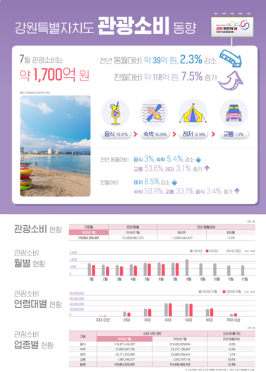 7월 관광소비는 약 1,700억원으로 전년 동월대비 2.3%(약 39억 원) 소폭 감소했으나, 전월 대비 7.5%(약 118억 원) 증가했다.