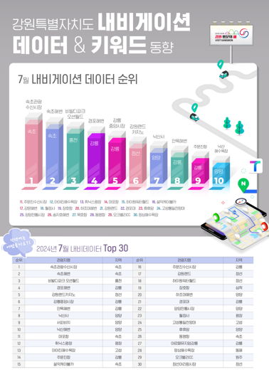 ‘강원 방문의 해 7월 추천 여행지’로 집중 조명된 동해시· 홍천군의 주요 관광지 경우, 동해시는 도째비골해랑전망대(65.17%), 망상해변(18.47%)이, 홍천군은 가리산자연휴양림(30.93%), 화로구이 골목(17.82%) 등의 관광지가 전년 동월대비 높은 관광객 증가세를 보였다.
