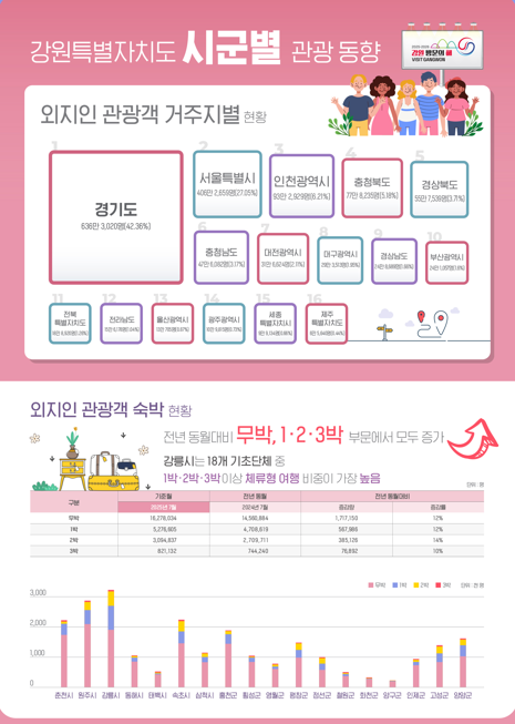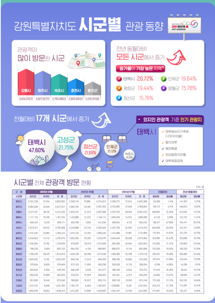 올해 7월은 전년 동월 대비 18개 시군의 관광객이 모두 증가하며, 여름 성수기 효과를 극명하게 확인할 수 있었다. 이 중 태백시는 전년 동월대비 가장 높은 관광객 증가율(20.72%)을 기록했다.