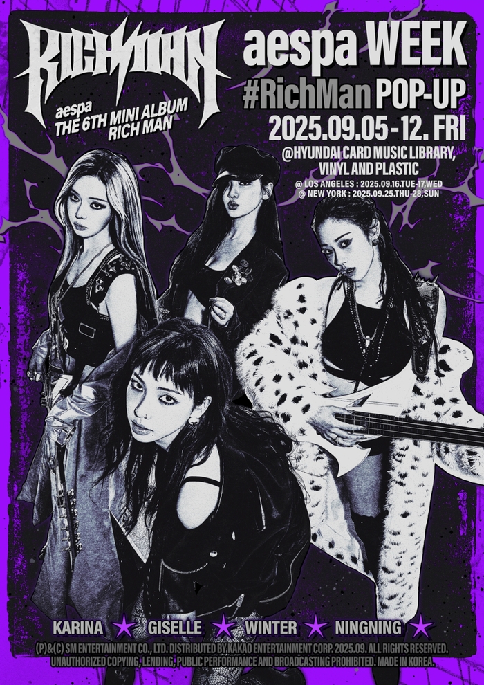에스파 미니 6집 ‘Rich Man’ 프로모션 팝업 ‘WEEK #RichMan POP-UP @ SEOUL’(위크 #리치맨 팝업 @서울)은 9월 5일부터 12일까지 현대카드 뮤직 라이브러리(서울 용산구 이태원로 246), 현대카드 바이닐 앤 플라스틱(서울 용산구 이태원로 248) 두 개의 공간에서 진행된다. 공식 팬클럽 멤버십 회원 전용 회차로 운영되는 오후 12시~1시 타임을 제외한 그 외의 시간은 현장 대기를 통해 운영된다.