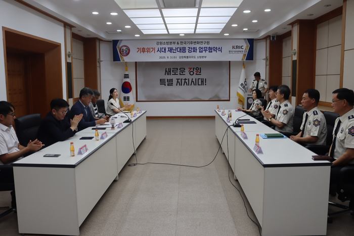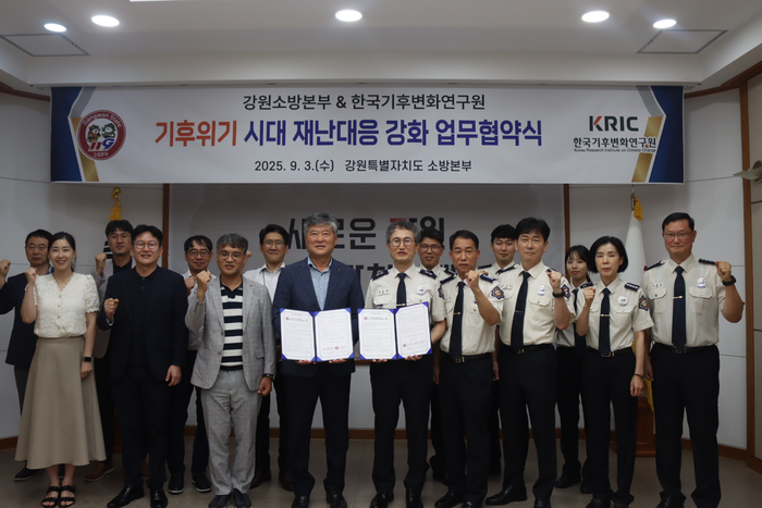 [스포츠서울ㅣ춘천=김기원기자]강원특별자치도 소방본부(본부장 김승룡)는 9월 3일 강원특별자치도청에서 한국기후변화연구원과 기후변화에 따른 재난대응 역량 강화를 위한 ‘재난관리 공동 협력체계 구축 상호협력 업무협약’을 체결했다고 밝혔다.