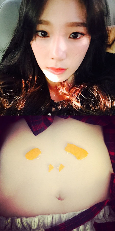 태연은 지난 17일 자신의 인스타그램에 사진 한 장을 게재했다. 공개된 사진에서 태연은 배 위에 귤 껍질을 올려 사람 얼굴 형상을 만들어 웃음을 줬다.