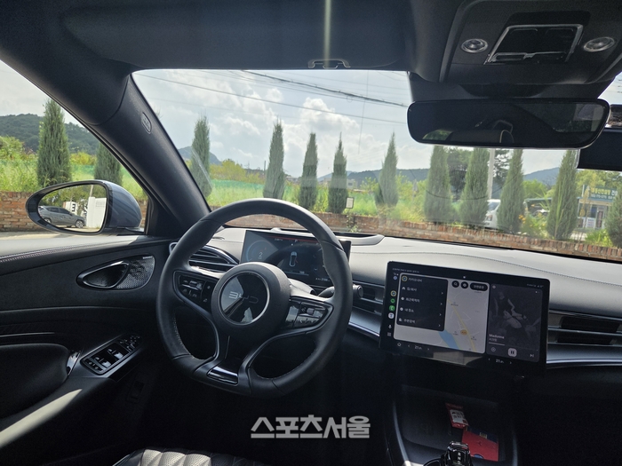 실내 역시 편견을 부순다. 천연 나파 가죽 시트, 앰비언트 조명 등도 기대 이상이다. 핸들을 제외하고 물리적 버튼이 거의 없다. 센터페시아의 디스플레이로 공조기 등을 쉽게 조작할 수 있다. 다른 차에는 없는 재밌는 기능 중 하나는 노래방이다. 최근 전 세계 히트 애니메이션 ‘케이팝 데몬 헌터스’의 OST ‘골든’ ‘소다팝’ 등도 코러스만 입힌 반주가 나와 따라 부를 수 있게 했다.